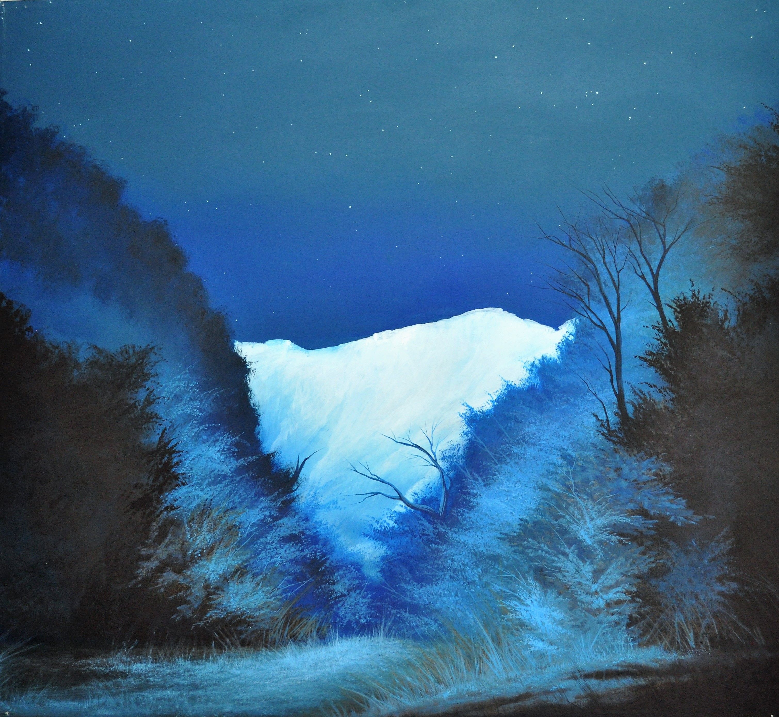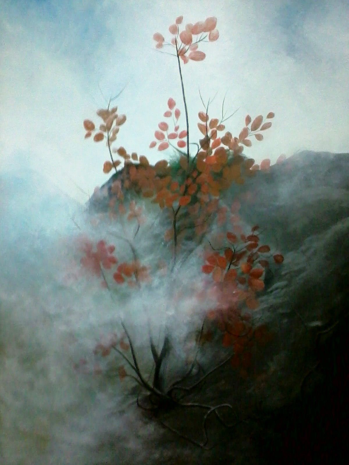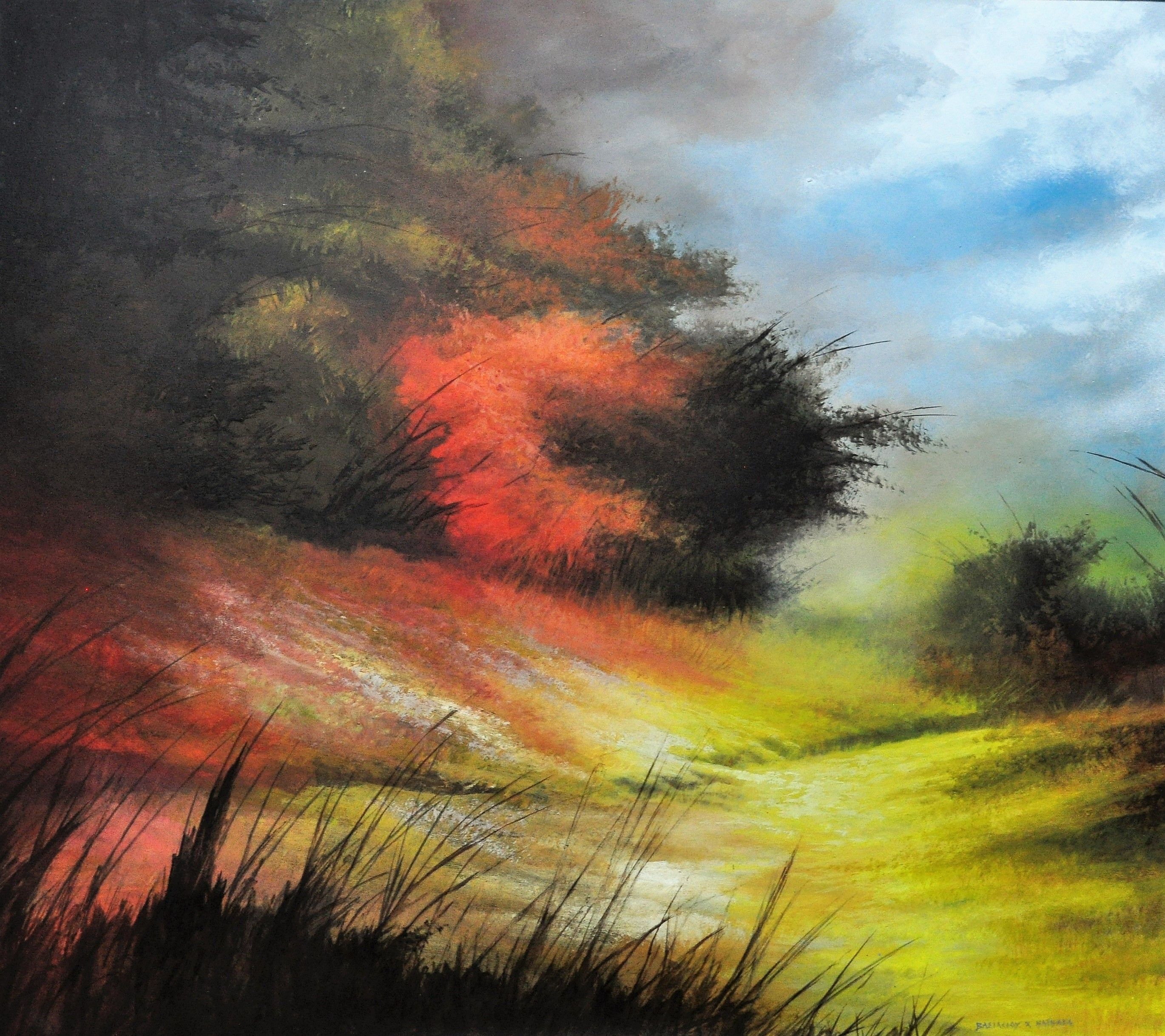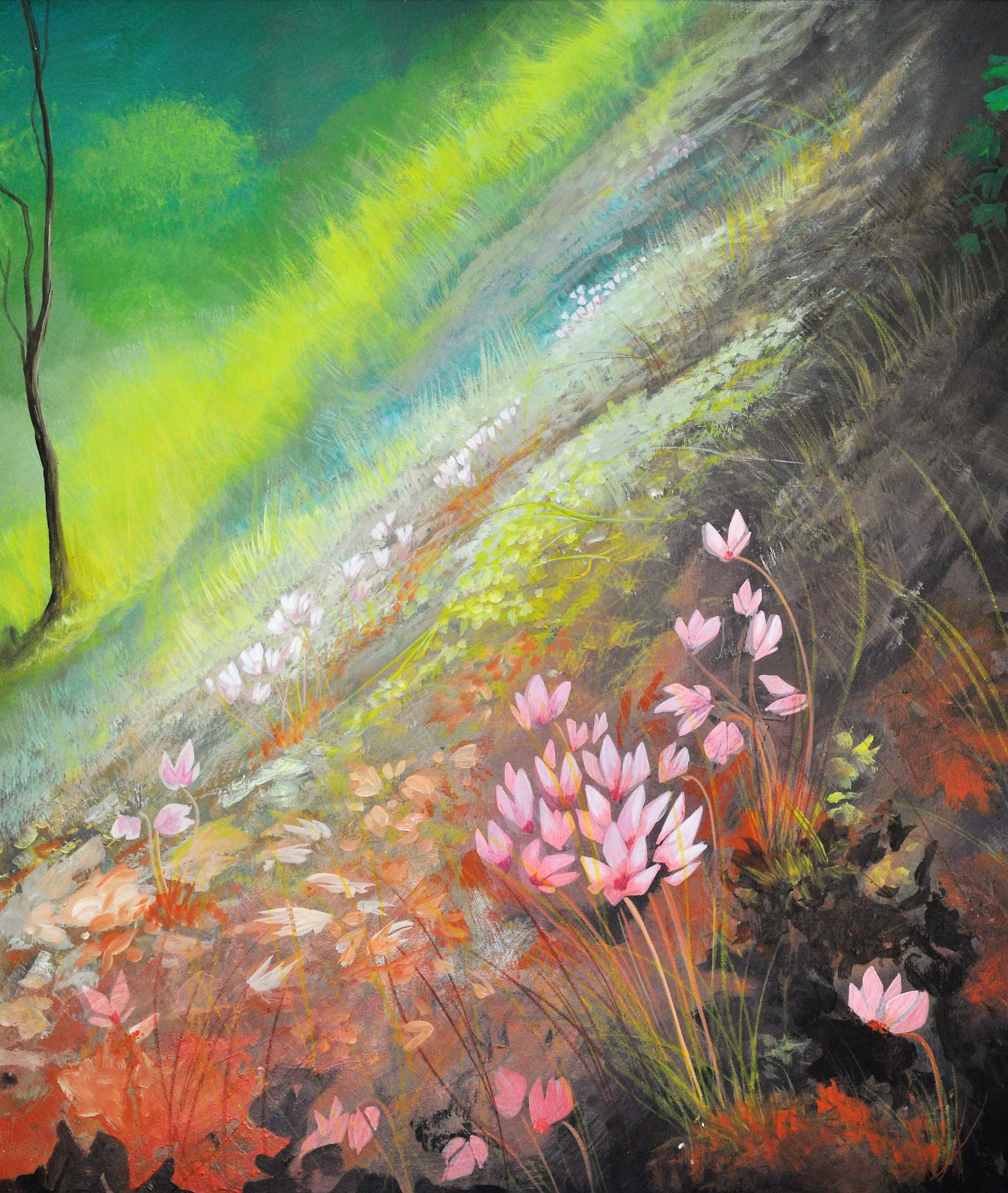 The outdoor compositions convey to the receiver personal gazes from journeys through the seasons, changes of time, reflections projected by the pulsating intensity of the siege light, until its last. Yellow, red, blue, brown are mixed, combined, shaped and depicted on canvas’ dreamy, transcendental natures.